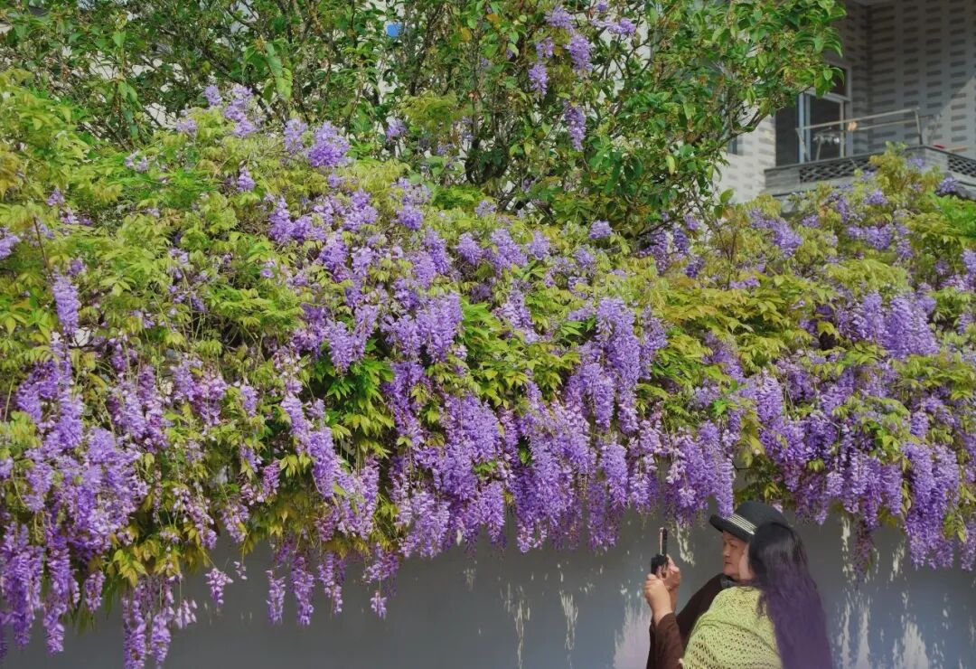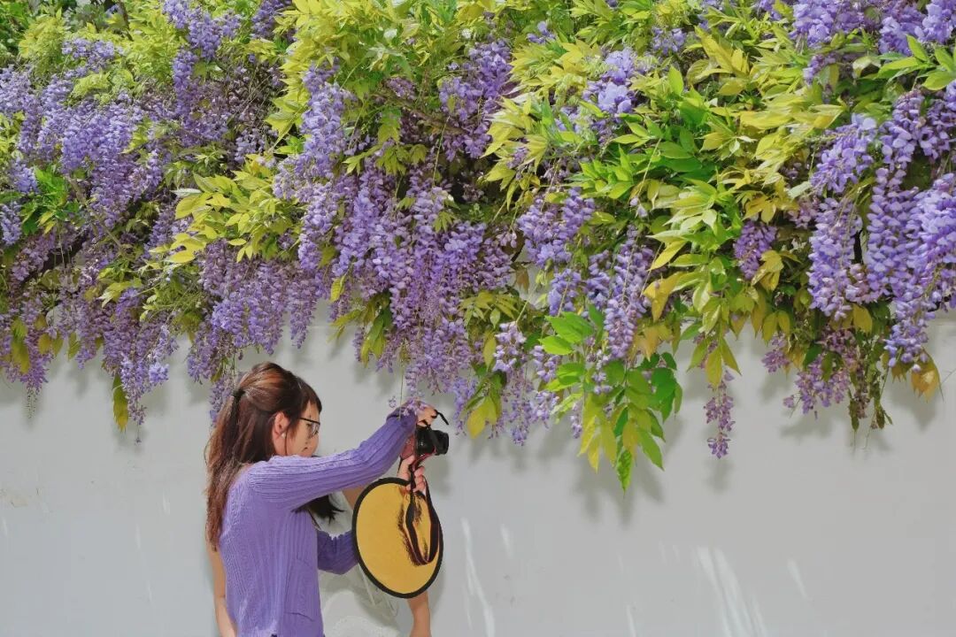 “春天来了,一年一度的紫藤花又准时绽放了,这么美的花墙,你们还不来打卡吗?我已经先来拍美照啦!”市民杨晓翼热情地向身边人推荐这处宝藏赏花点。