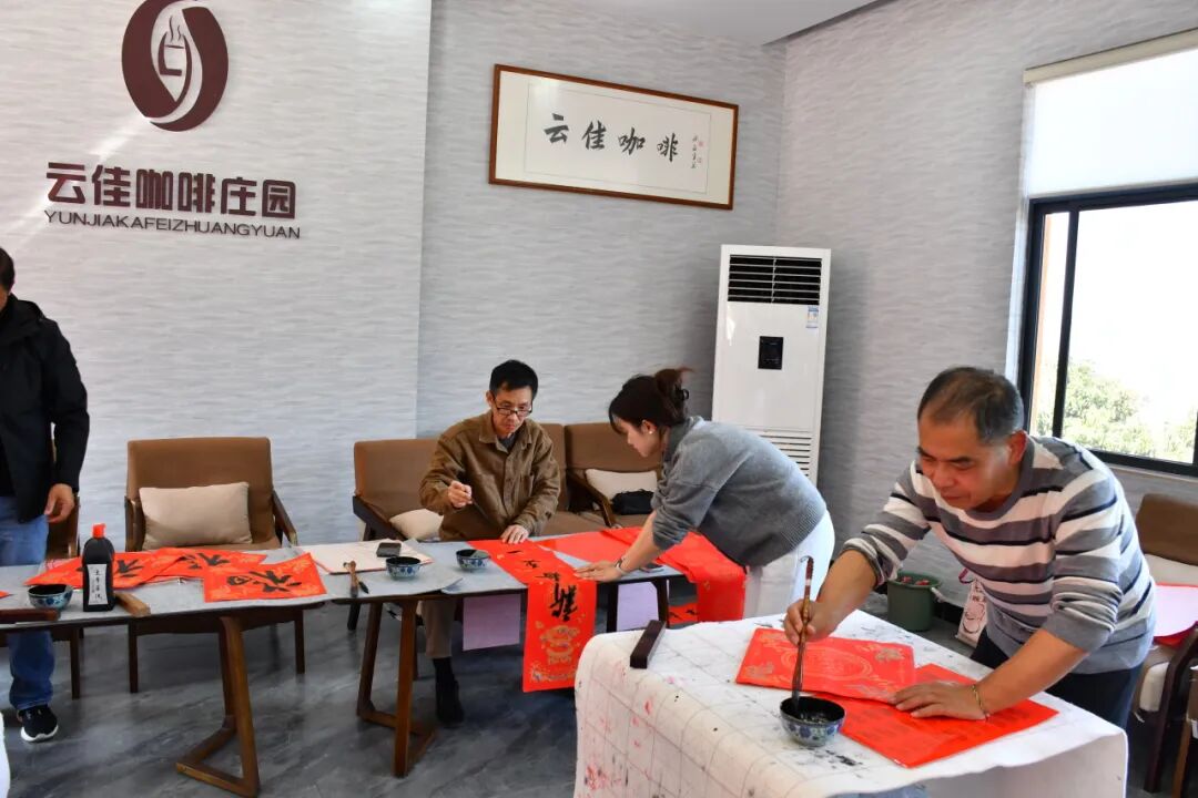 闻讯而来的群众络绎不绝,大家有序排队,挑选心仪的对联内容,看着书法家们现场书写,脸上满是期待与喜悦。拿到手写春联和福字的群众,爱不释手、连连称赞,纷纷表示“手写的春联才有年味,贴在门上特别喜庆”。随后,书法家们又来到云佳咖啡公司,为企业职工现场书写春联福字,将新春祝福送到生产一线,让企业职工在忙碌之余感受到浓浓的节日温暖与文化关怀。