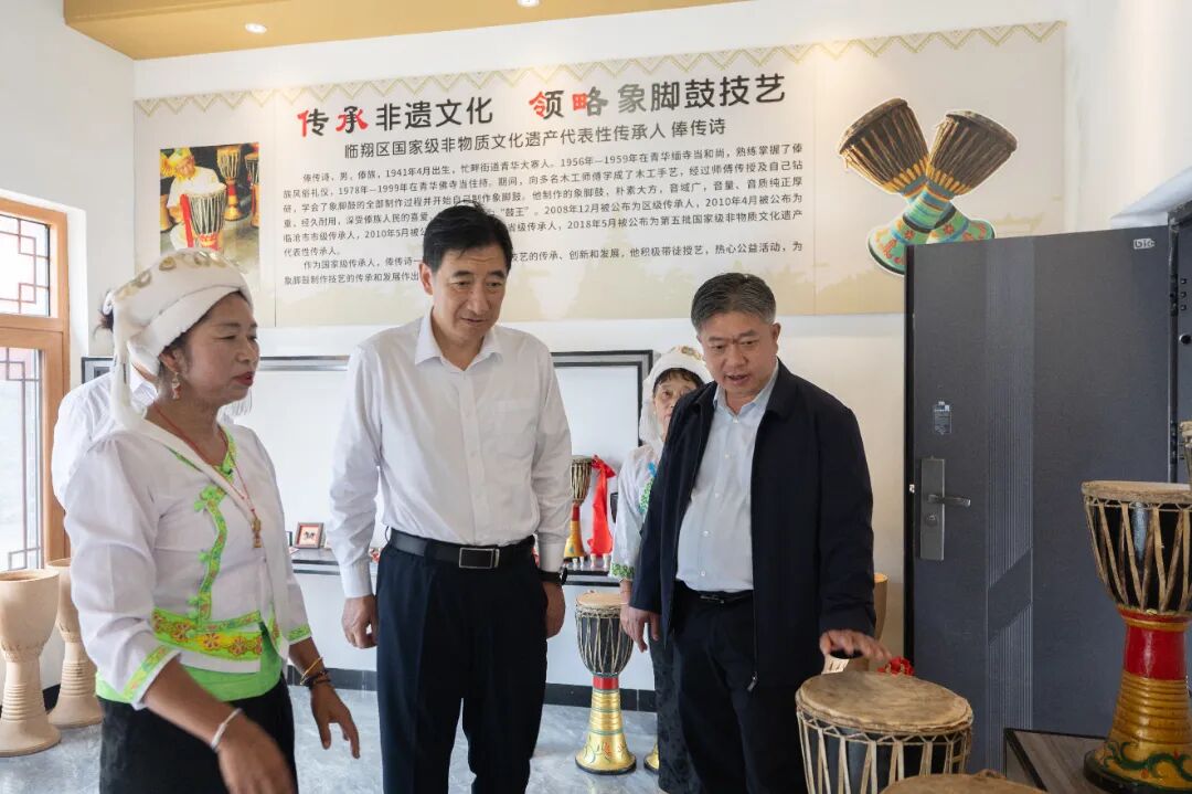 杜建辉来到象脚鼓技艺传承人俸花家中,深入了解傣族象脚鼓技艺的保护与传承情况,勉励他们要坚持传承与创新相结合、古老技艺与时尚需求相结合,让非遗文化产品在市场化竞争中焕发新生机。