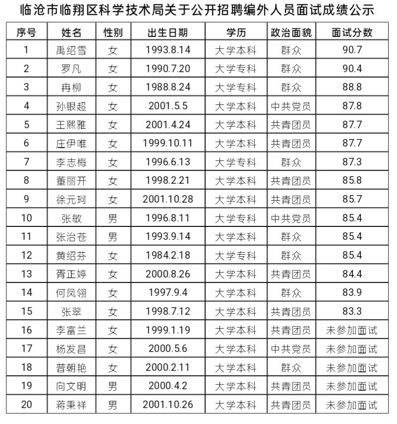 临翔区科学技术局于2025年12月23日召开局党组会议,就确定编制外人员录用事宜进行研究,会议认为本次公开招聘工作组织严密,流程规范,自公告发布、资格审核至面试考核全过程均严格遵守公平、公正、公开的原则,面试结果客观反映了应试人员的综合能力,基于面试结果和岗位匹配度,会议决定拟录用禹绍雪(女,汉族,1993年8月生,群众,大学本科学历)为临翔区科技局编制外人员。