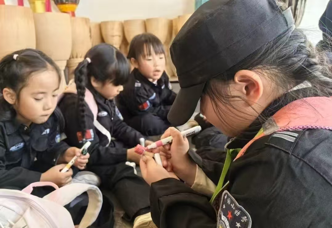 市级非遗传承人俸花老师详细介绍了象脚鼓的历史渊源与制作工序:从选材砍料到下料定型、内部镂空、浸泡防裂、修整打磨、雕刻花纹、上身着色,再到鼓皮制作、绷制鼓面、着色彩绘。十个步骤环环相扣,孩子们惊叹于这门指尖上的绝艺。最受欢迎的环节是彩绘体验,警娃们手握画笔,为小号象脚鼓白胚涂上心中的色彩——孔雀蓝、金色、红色……每一笔都饱含对美的理解与文化的认同。
