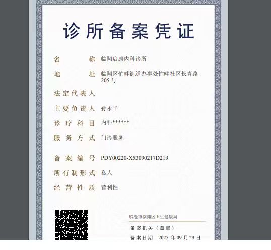 我局于2025年09月29日收到临翔启康内科诊所申请,根据《诊所备案管理暂行办法》,经审核,于2025年09月29日拟诊所备案许可申请。现将批准事项公示如下: