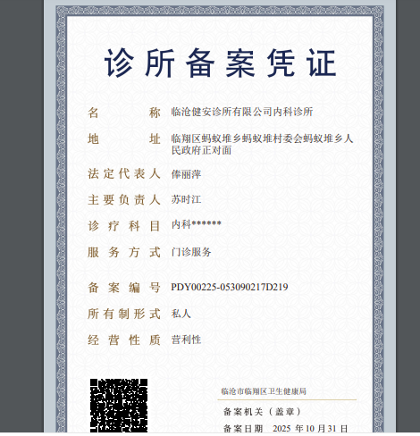 医疗机构名称:临沧健安诊所有限公司内科诊所