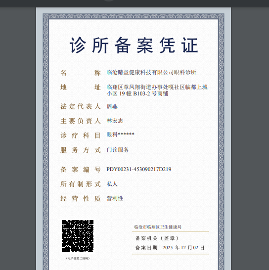 诊所名称: 临沧睛盈健康科技有限公司眼科诊所