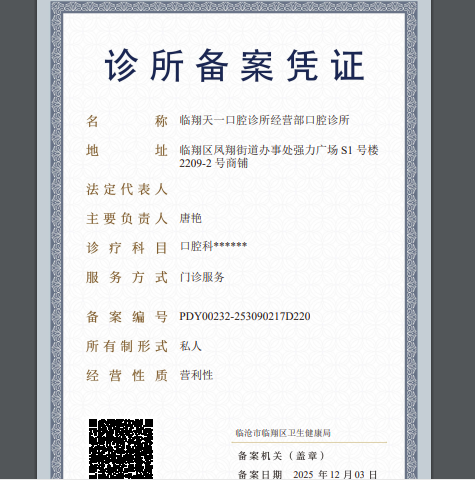我局于2025年12月03日收到临翔天一口腔诊所经营部口腔诊所申请,根据《诊所备案管理暂行办法》,经审核,于2025年12月09日拟诊所备案申请。现将批准事项公示如下: