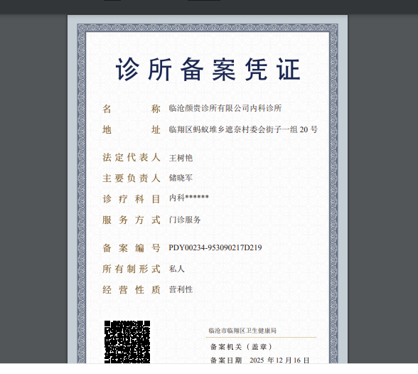 诊所备案凭证申请公示(临沧颜贵诊所有限公司内科诊所)
