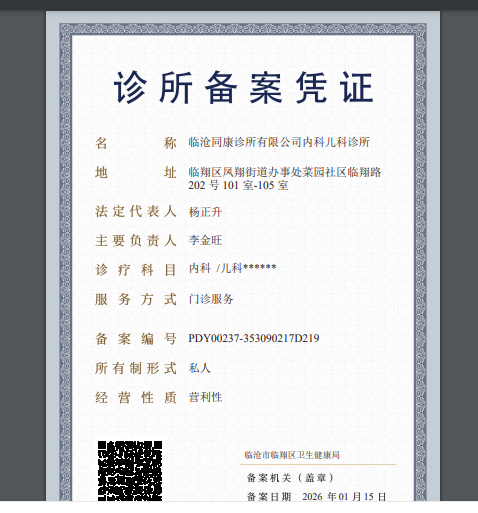 医疗机构名称:临沧同康诊所有限公司内科儿科诊所