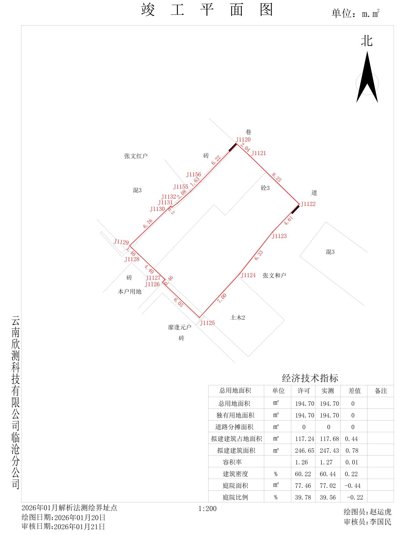 竣工主要经济技术指标 | 建筑面积:247.43㎡,建筑密度:60.44%,容积率:1.27,庭院占比:39.23%,建筑层数为地上1层至地上局部3层 |