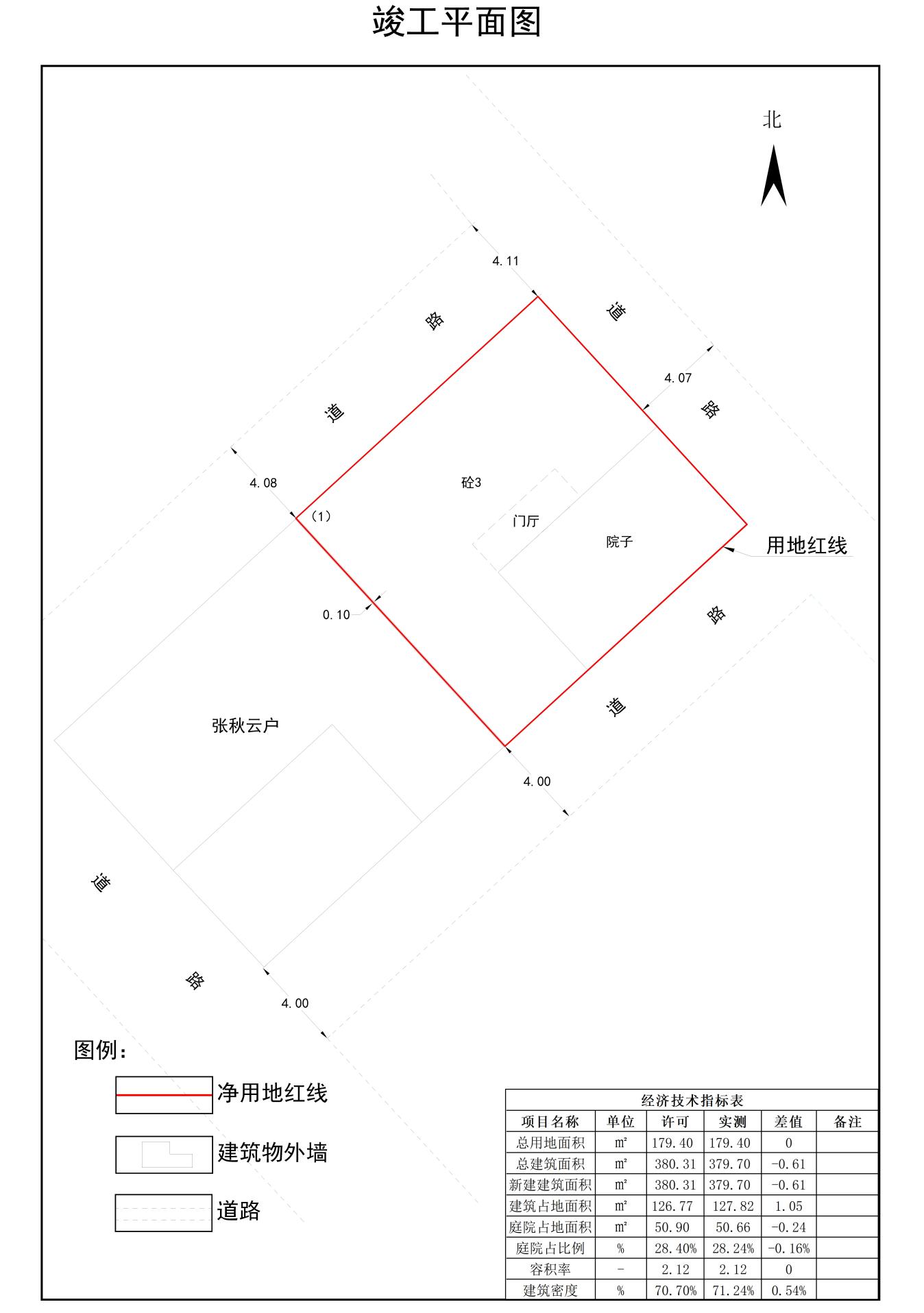竣工主要经济技术指标 | 建筑面积:379.70㎡,建筑密度:71.24%,容积率:2.12,庭院占比:28.24%,建筑层数为地上1层至地上3层 |