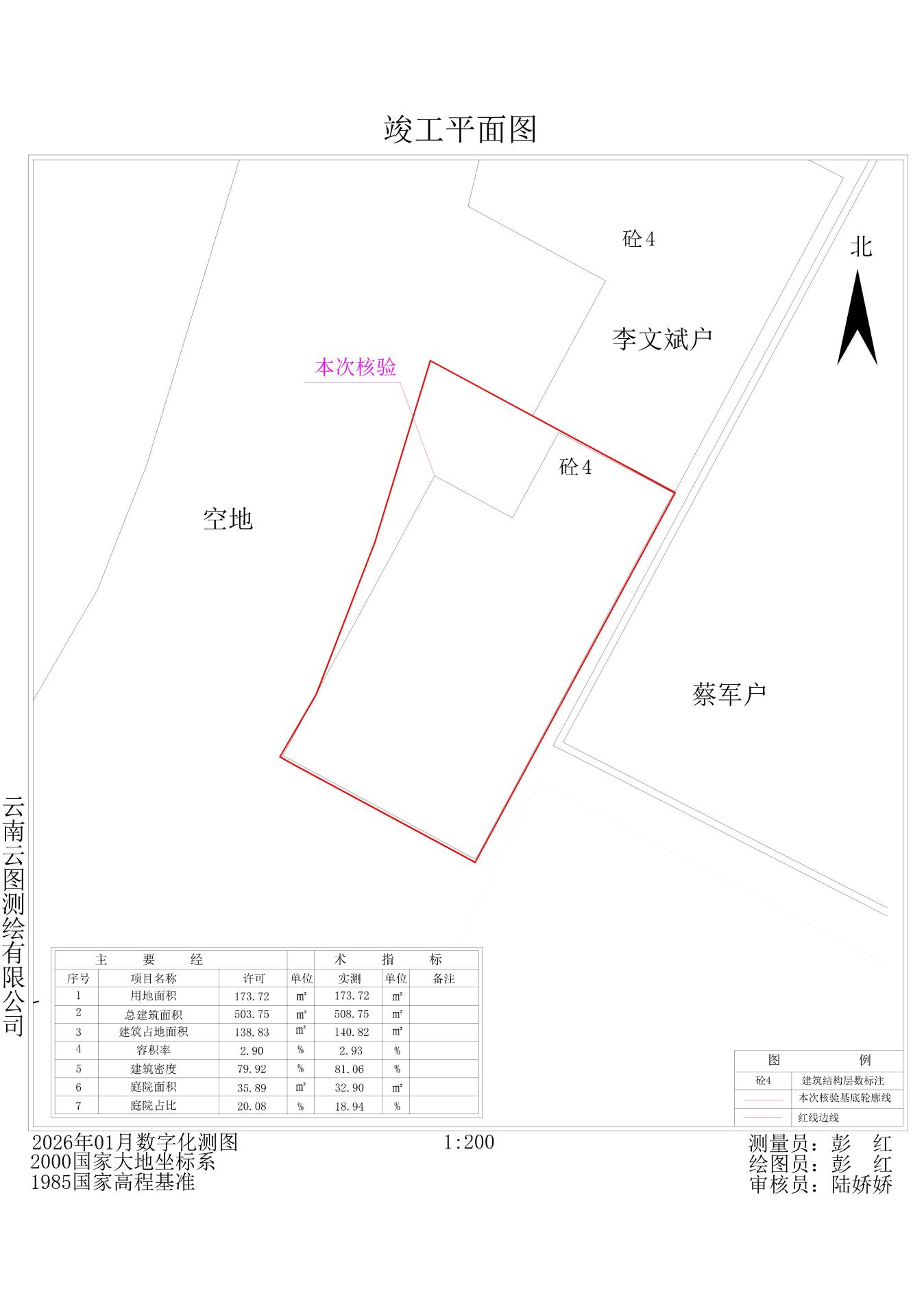 竣工主要经济技术指标 | 建筑面积:508.75㎡,建筑密度:81.06%,容积率:2.93,庭院占比:18.94%,建筑层数为地上1层至地上4层 |