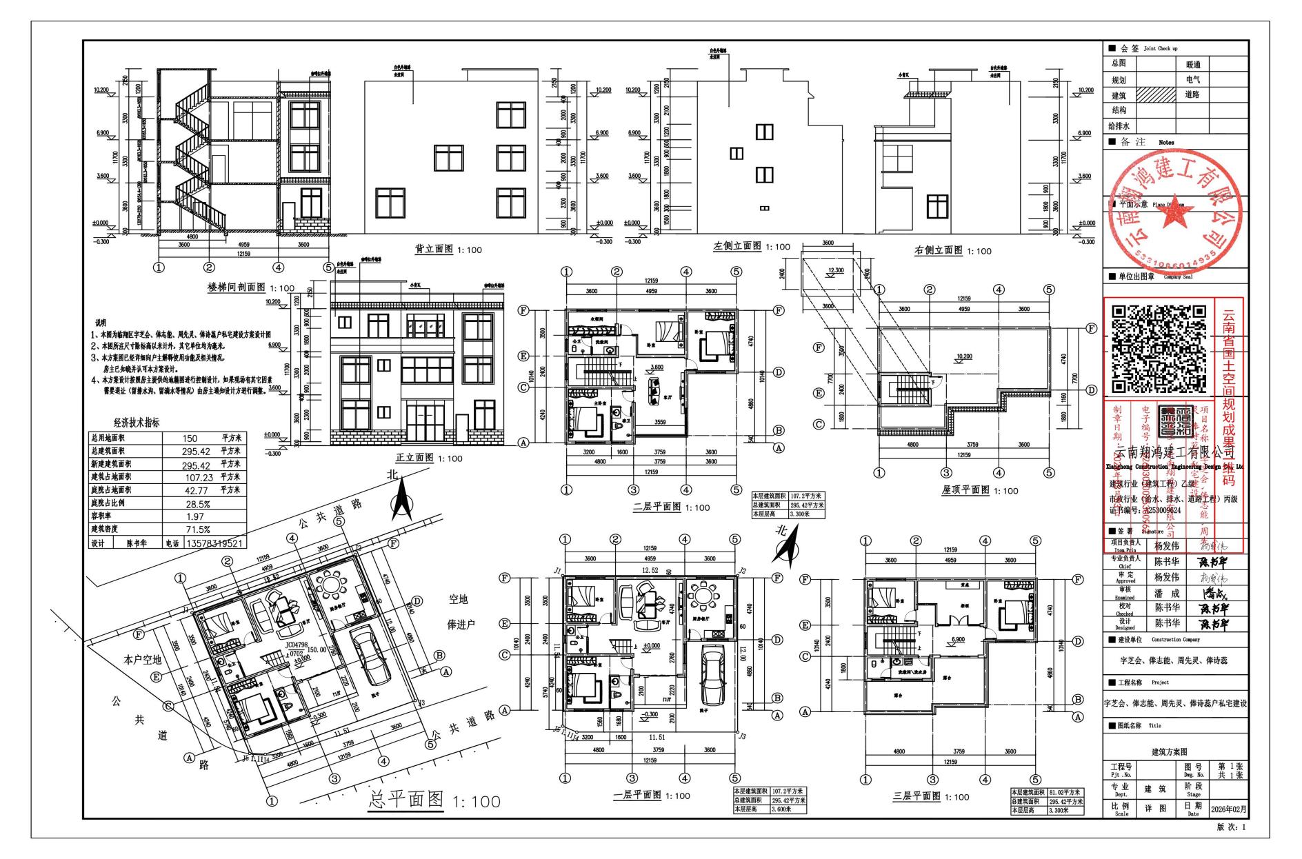 主要经济技术指标 | 用地面积:150㎡,新建建筑面积:295.42㎡,建筑占地面积107.23㎡,建筑密度71.50%,容积率1.97,庭院占比28.50%,建筑层数为地上1层至地上局部3层 |