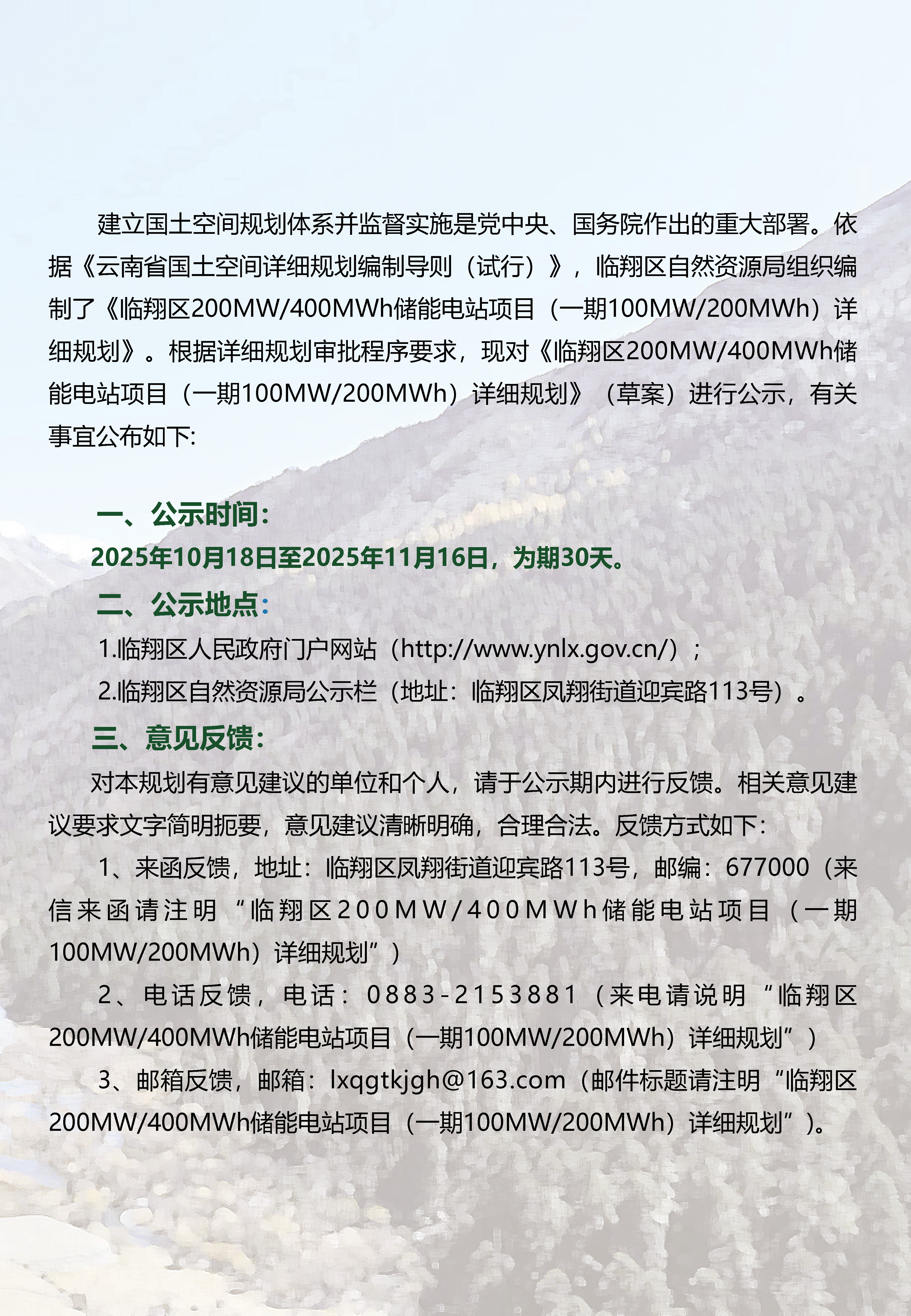 临翔区200MW400MWh储能电站项目(一期100MW200MWh)详细规划(草案公示稿)