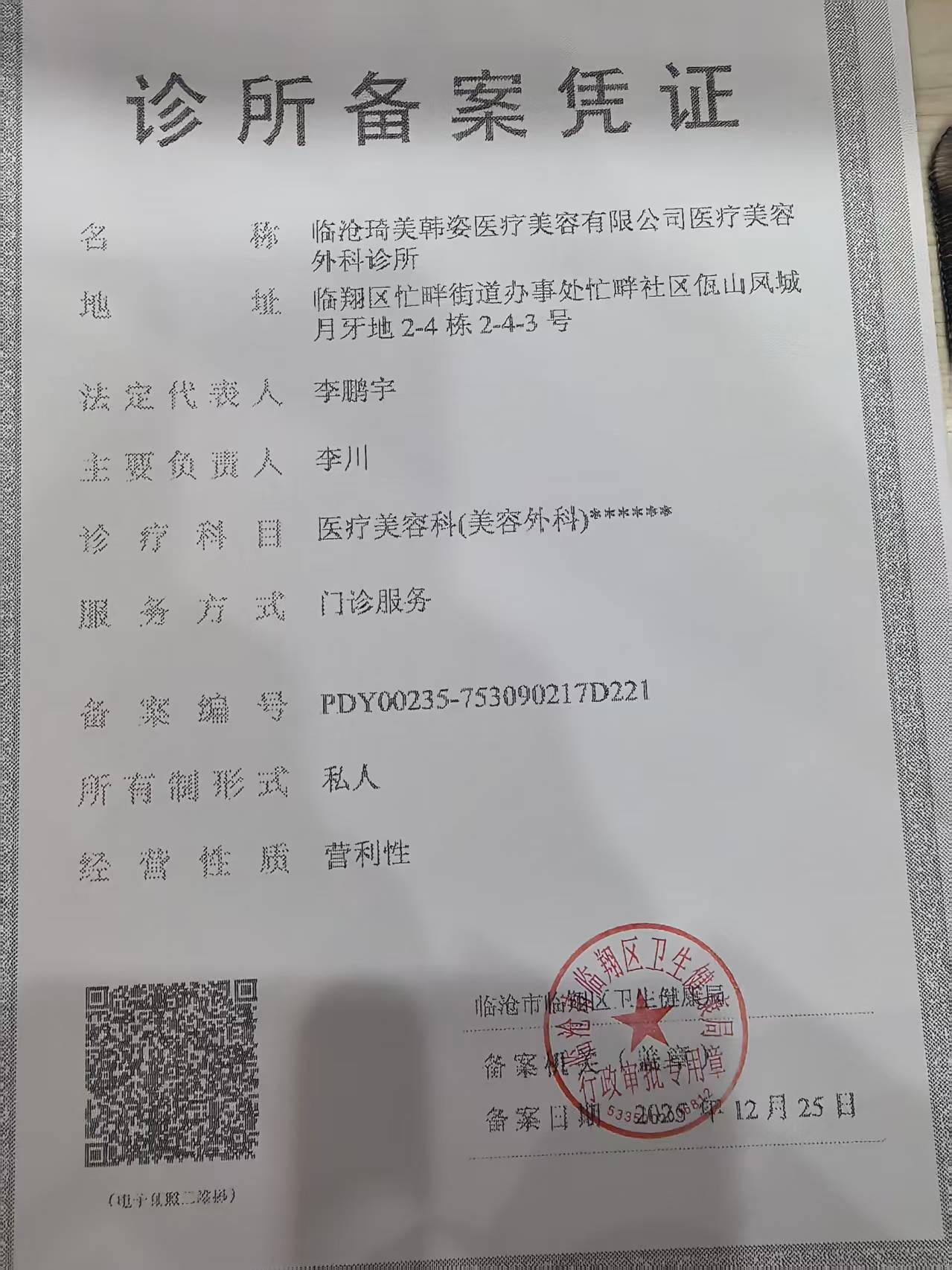 医疗机构名称:临沧琦美韩姿医疗美容有限公司医疗美容外科诊所