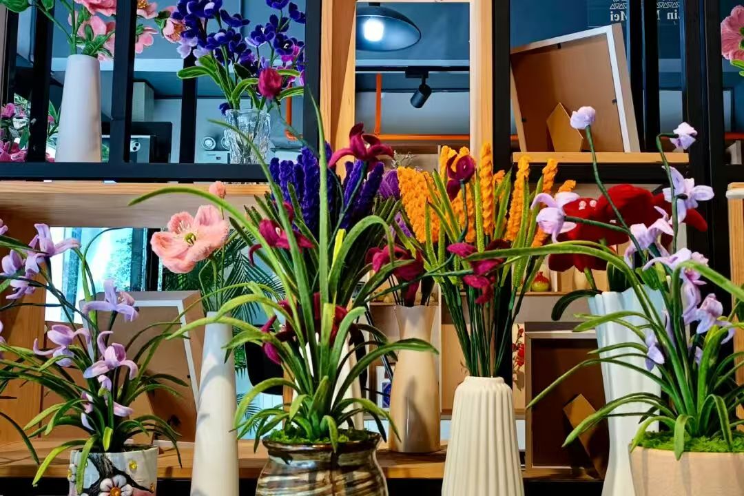 10月14日,记者走进玉龙社区民族文创工坊,暖黄灯光倾泻而下,四五位居民围坐长桌,目光专注地投身于扭扭花制作中。现场分工有序,有人捏着银色铁丝打底,有人用粉、黄、紫等各色扭扭棒缠绕出圆润花芯、折出翘边花瓣,还有人细致裹出带叶花茎。桌上散落的半成品缀着柔软绒毛,在透过窗棂的阳光下泛着鲜活微光,指尖流转间,既显手工巧思,又蕴民族风情。