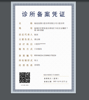 我局于2025年10月22日收到临沧齿颜口腔诊所有限公司口腔诊所申请,根据《诊所备案管理暂行办法》,经审核,于2025年10月22日拟诊所备案许可申请。现将批准事项公示如下: