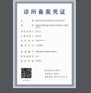 医疗机构名称:临沧益佳诊所有限责任公司内科诊所